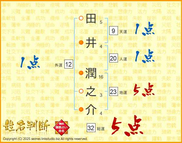 田(5画)井(4画) 潤(16画)之(3画)介(4画)