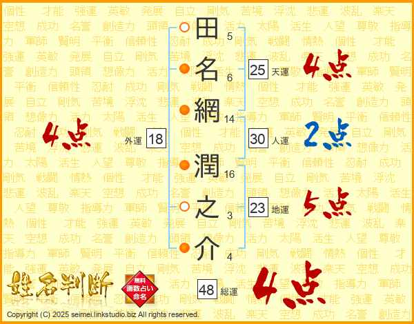 田(5画)名(6画)網(14画) 潤(16画)之(3画)介(4画)