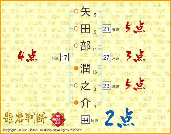 矢(5画)田(5画)部(11画) 潤(16画)之(3画)介(4画)