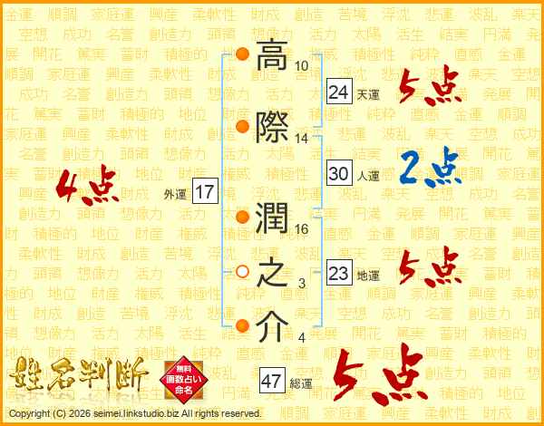 高(10画)際(14画) 潤(16画)之(3画)介(4画)