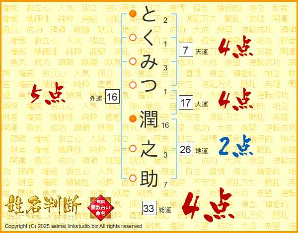と(2画)く(1画)み(3画)つ(1画) 潤(16画)之(3画)助(7画)