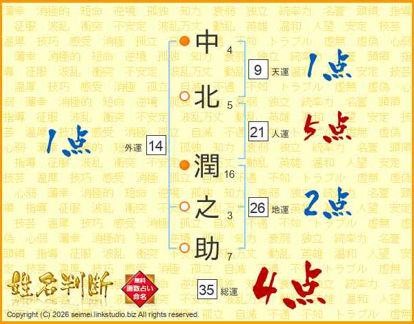 中(4画)北(5画) 潤(16画)之(3画)助(7画)