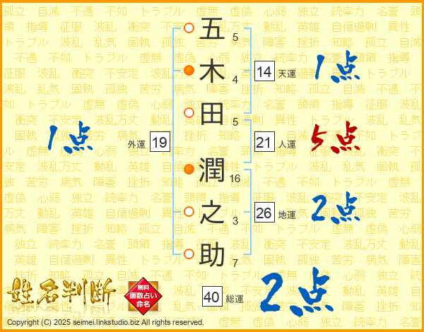 五(5画)木(4画)田(5画) 潤(16画)之(3画)助(7画)