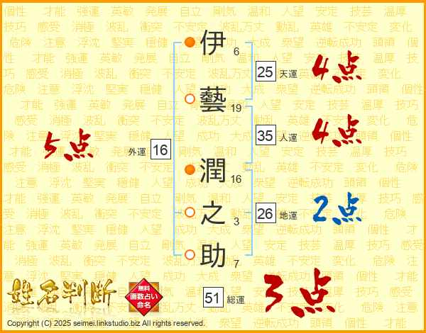 伊(6画)藝(19画) 潤(16画)之(3画)助(7画)