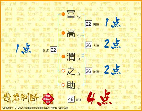 冨(12画)高(10画) 潤(16画)之(3画)助(7画)