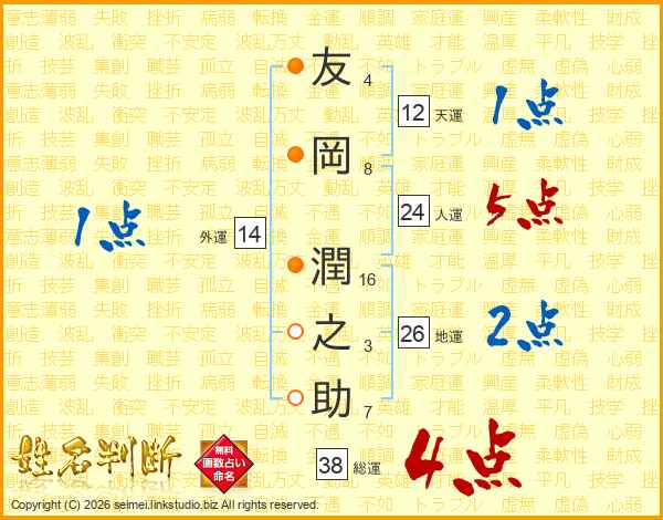 友(4画)岡(8画) 潤(16画)之(3画)助(7画)