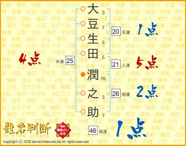 大豆生田潤之助さんの総運は46画の1点!