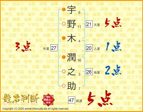 宇(6画)野(11画)木(4画) 潤(16画)之(3画)助(7画)