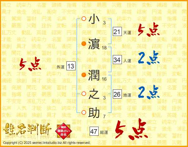 小(3画)濵(18画) 潤(16画)之(3画)助(7画)
