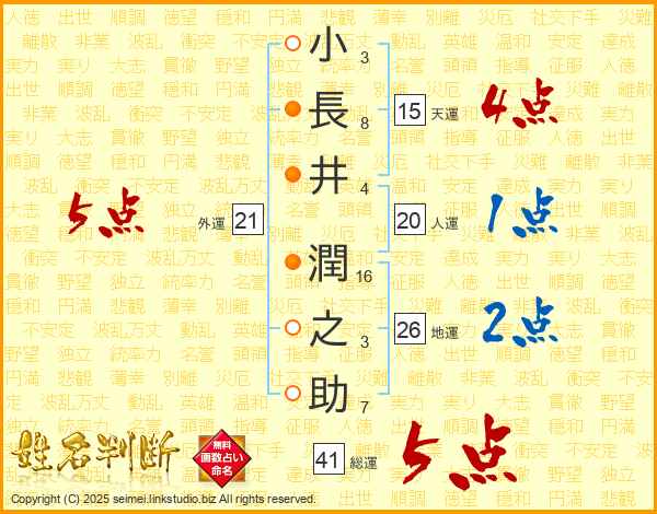 小(3画)長(8画)井(4画) 潤(16画)之(3画)助(7画)