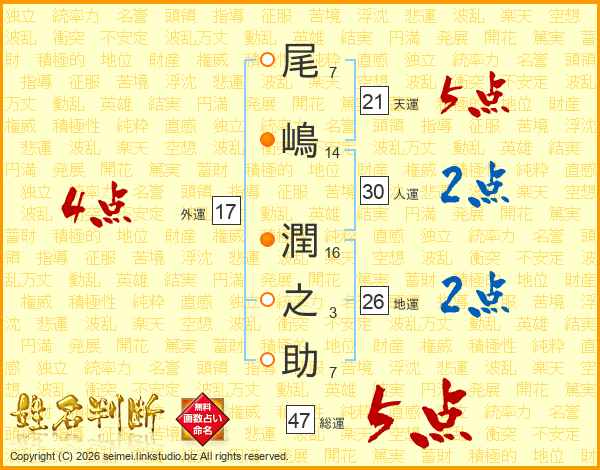 尾(7画)嶋(14画) 潤(16画)之(3画)助(7画)