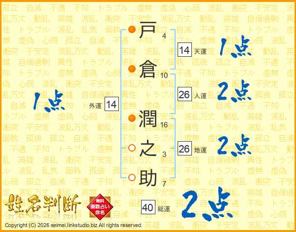 戸(4画)倉(10画) 潤(16画)之(3画)助(7画)
