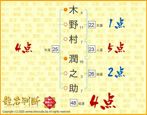木(4画)野(11画)村(7画) 潤(16画)之(3画)助(7画)