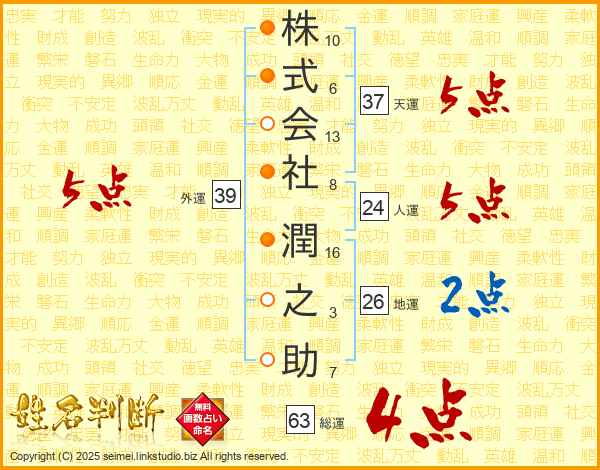 株(10画)式(6画)会(13画)社(8画) 潤(16画)之(3画)助(7画)