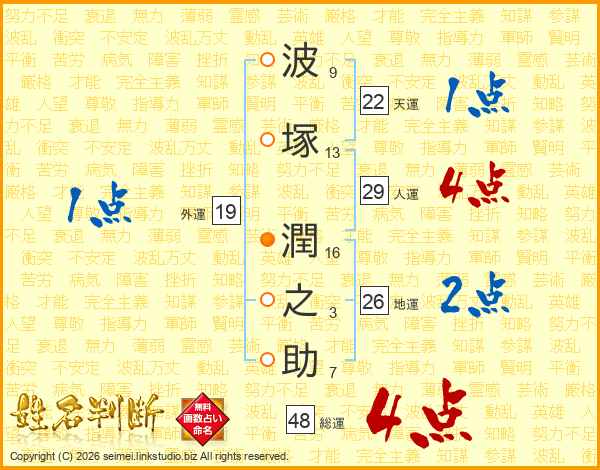 波(9画)塚(13画) 潤(16画)之(3画)助(7画)
