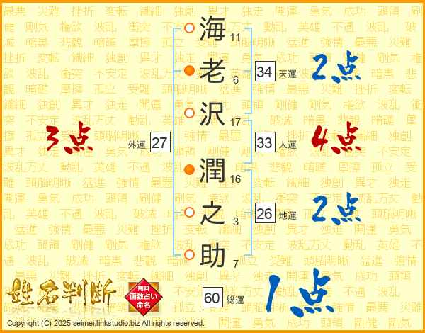 海(11画)老(6画)沢(17画) 潤(16画)之(3画)助(7画)