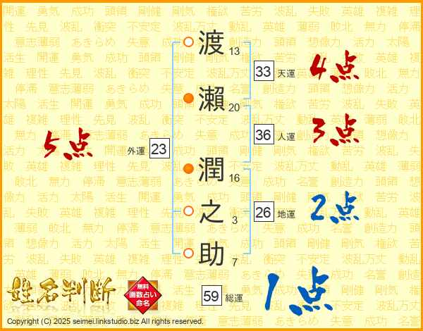 渡(13画)瀨(20画) 潤(16画)之(3画)助(7画)