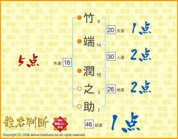 竹(6画)端(14画) 潤(16画)之(3画)助(7画)