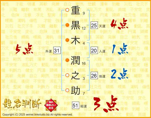 重(9画)黒(12画)木(4画) 潤(16画)之(3画)助(7画)