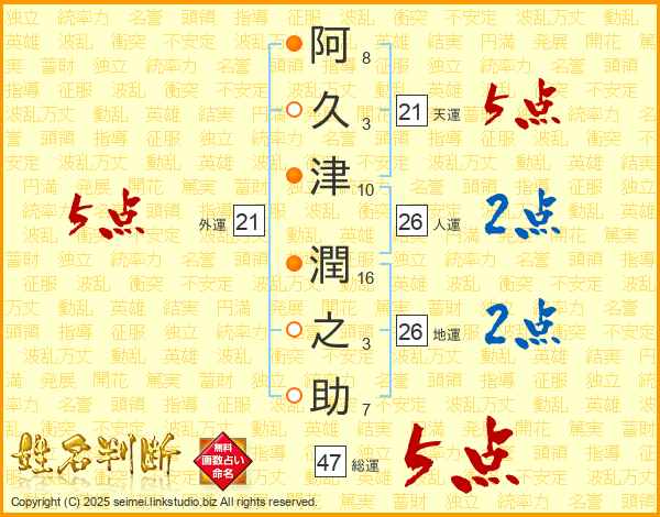 阿(8画)久(3画)津(10画) 潤(16画)之(3画)助(7画)