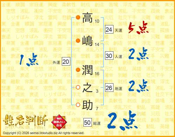 高(10画)嶋(14画) 潤(16画)之(3画)助(7画)