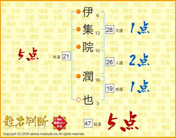 伊(6画)集(12画)院(10画) 潤(16画)也(3画)