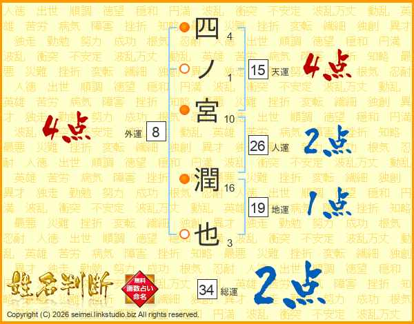 四ノ宮潤也さんの総運は34画の2点!