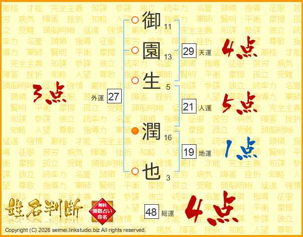 御(11画)園(13画)生(5画) 潤(16画)也(3画)
