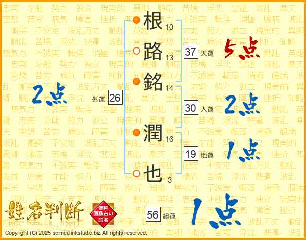 根(10画)路(13画)銘(14画) 潤(16画)也(3画)