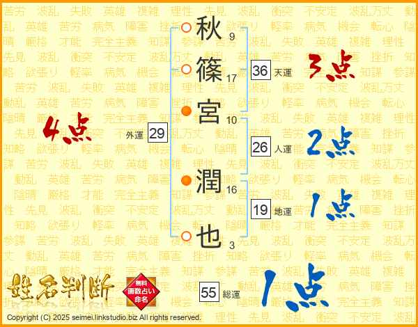 秋(9画)篠(17画)宮(10画) 潤(16画)也(3画)