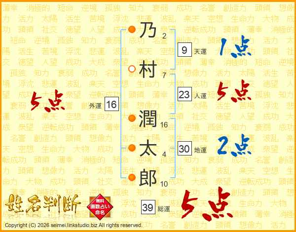 乃(2画)村(7画) 潤(16画)太(4画)郎(10画)