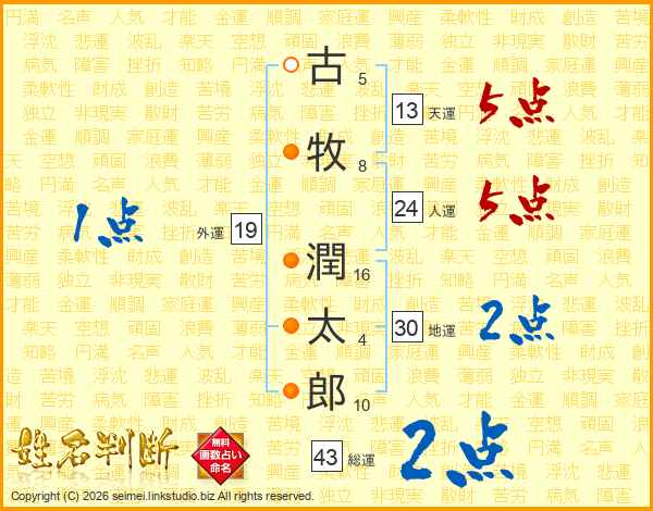 古(5画)牧(8画) 潤(16画)太(4画)郎(10画)