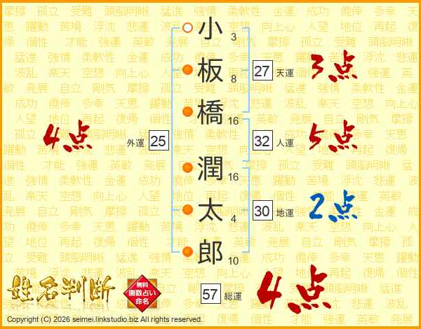 小板橋潤太郎さんの総運は57画の4点!