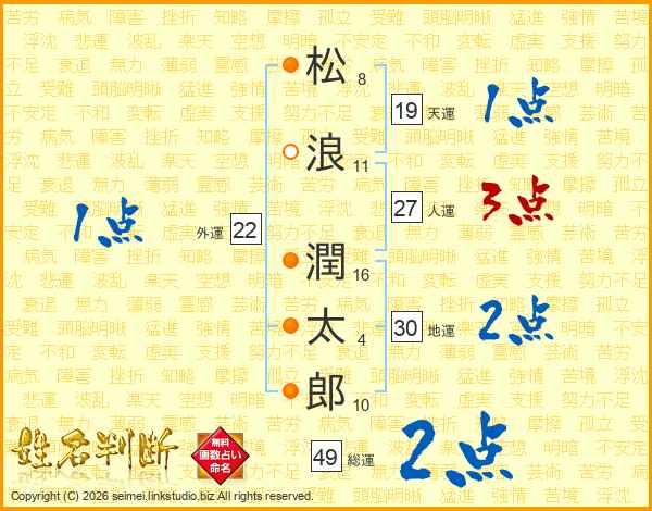 松(8画)浪(11画) 潤(16画)太(4画)郎(10画)