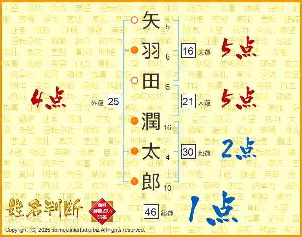 矢(5画)羽(6画)田(5画) 潤(16画)太(4画)郎(10画)