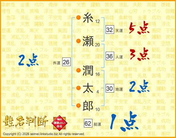 糸(12画)瀬(20画) 潤(16画)太(4画)郎(10画)