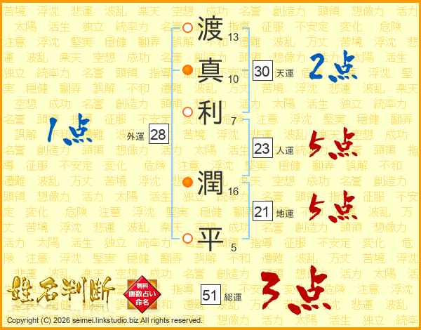渡(13画)真(10画)利(7画) 潤(16画)平(5画)
