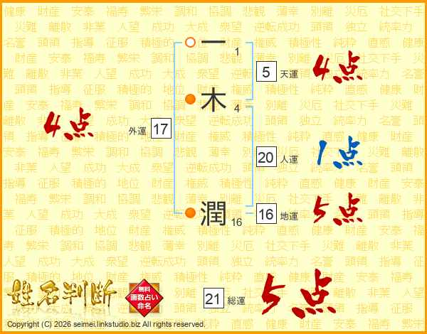 あなたの人生を表す1番重要な運勢です。生涯を通じて影響する総合運となり、主に50歳以降の晩年期に影響を及ぼします。苗字と名前の合計画数。
