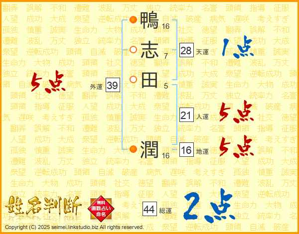 鴨(16画)志(7画)田(5画) 潤(16画)
