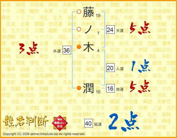 藤(19画)ノ(1画)木(4画) 潤(16画)