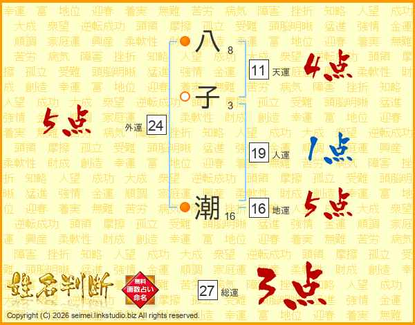 あなたの人生を表す1番重要な運勢です。生涯を通じて影響する総合運となり、主に50歳以降の晩年期に影響を及ぼします。苗字と名前の合計画数。