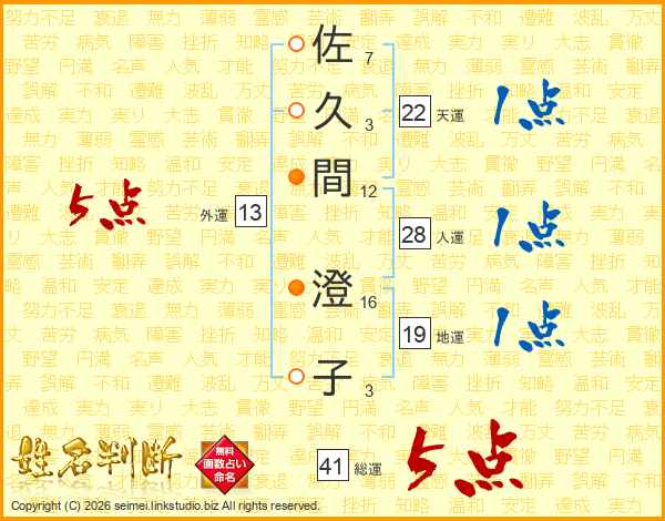 佐(7画)久(3画)間(12画) 澄(16画)子(3画)