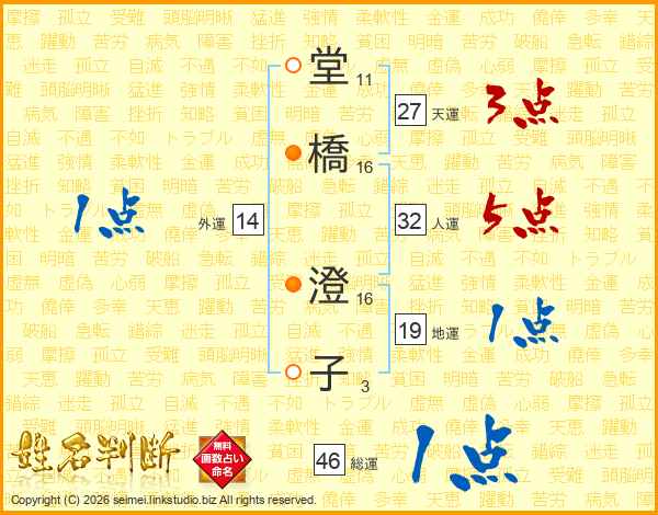 堂(11画)橋(16画) 澄(16画)子(3画)