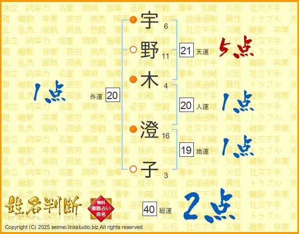 宇(6画)野(11画)木(4画) 澄(16画)子(3画)
