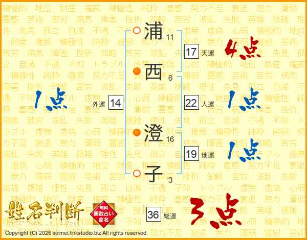 浦(11画)西(6画) 澄(16画)子(3画)