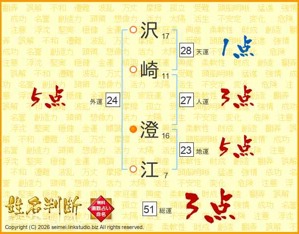 沢(17画)崎(11画) 澄(16画)江(7画)