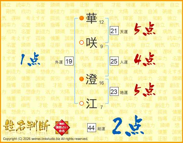 あなたの人生を表す1番重要な運勢です。生涯を通じて影響する総合運となり、主に50歳以降の晩年期に影響を及ぼします。苗字と名前の合計画数。