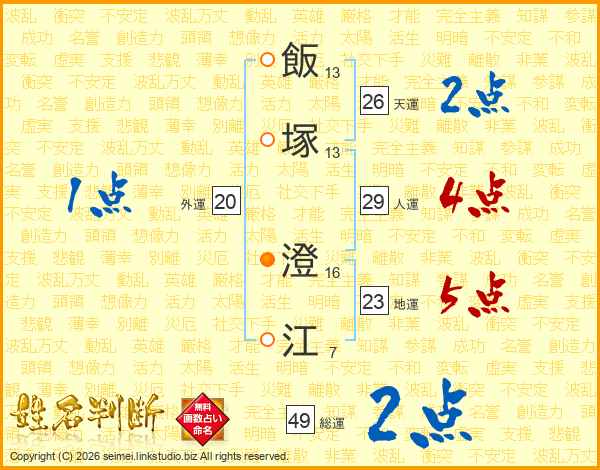 飯(13画)塚(13画) 澄(16画)江(7画)