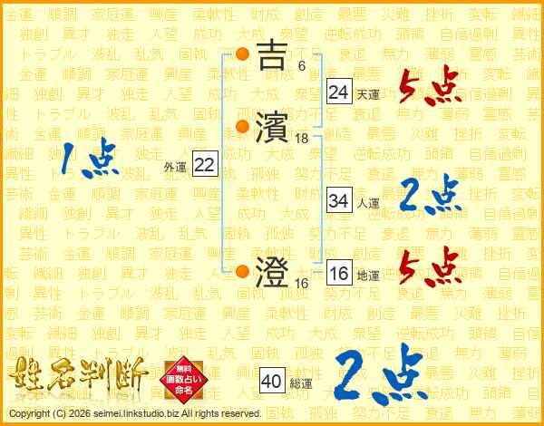 画数の奇数(○陽)と偶数(●陰)の配列で吉凶を占います。どちらかにかたよる名前は大凶名で避ける必要があります。画数の奇数偶数。