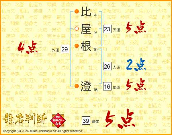 比(4画)屋(9画)根(10画) 澄(16画)